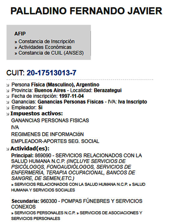 Dicho médico, asimismo, prestaría servicios también en el hospital ‘Evita Pueblo’ de Be-razategui. Pero cuando recurrimos a las bases de datos en internet, el doctor Palladino está registrado con una segunda actividad, precisamente la de ‘funeraria’ lo que no solo no es ético, sino macabro porque pone sobre el tapete la actividad compartida y en una clínica con una muy dudosa reputación.