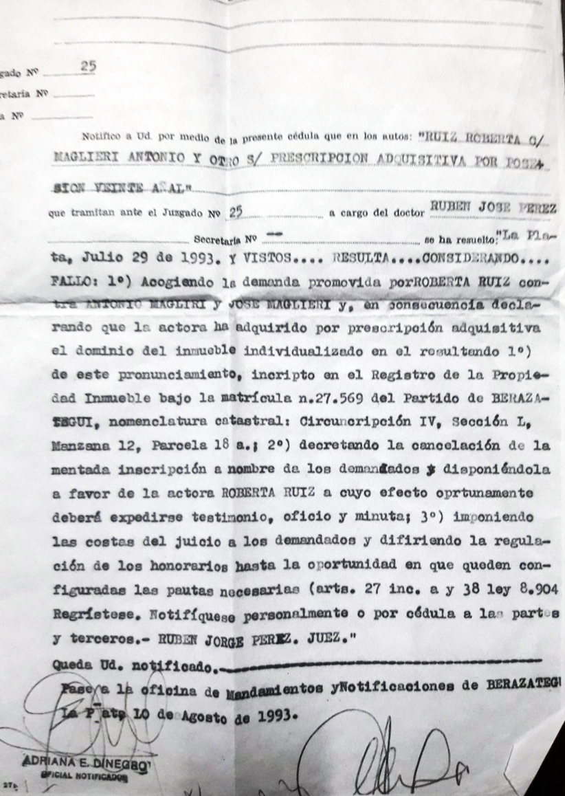 Ruiz aportó documentación oficial sobre un juicio por ‘prescripción adquisitiva por Posesión veinteanial’ contra Antonio Maglieri y otros, donde se observa un fallo fechado el 29 de julio de 1993 y que reza «Fallo: 1°) Acogiendo la denuncia promovida por Ro-berta Ruiz contra Antonio Maglieri, José Maglieri y, en consecuencia declarando que la actora ha adquirido por prescripción adquisitiva el dominio del inmueble indi-vidualizado en el resultando 1° de este pronunciamiento, inscripto en el Registro de la Propiedad Inmueble bajo la matrícula N° 27.569 del partido de Berazategui, nomenclatura catastral Circunscripción IV, sección L, manzana 12 parcela 18a; 2°) decretando la cancelación de la mentada inscripción a nombre de los demandados y disponiéndola a favor de la actora Roberta Ruiz, a cuyo efecto oportunamente deberá expedirse testimonio, oficio y minuta; 3°) imponiendo las costas del juicio a los demandados y difiriendo la regulación de los honorarios hasta la oportunidad en que queden configuradas en las pautas necesarias (arts. 27 inc. a y 38 ley 8904, Regístrese, notifíquese personalmente o por cédula a las partes y terceros» y firma Rubén Jorge Pérez, Juez en La Plata, 10 de agosto de 1993. La notificación respectiva la hizo Adriana Dinegro, oficial de Justicia.
