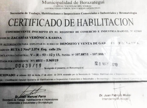 La gente que explota un depósito de garrafas en Colectora ruta 36 y calle 25C, exhibió certificados de habilitación del lugar -del año pasado- como «depósito y venta de garrafas» cuyos trámites están certificados por el secretario de Trabajo Juan Parra, y el entonces intendente Patricio Mussi. Los papeles en cuestión están a nombre de Verónica Karina Zacarías, y extrañamente se permitió que funcione ese local de almacenamiento de gas envasado en un lugar cerrado.