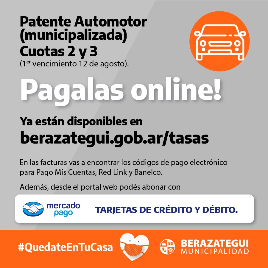 A través de la Secretaría de Economía, el Municipio de Berazategui comunicó que las cuotas 2 y 3 de la patente del Automotor, cuyo primer vencimiento es el 12 de agosto, ya están disponibles en la página web: berazategui.gob.ar/tasas. Se les informa a los vecinos que para poder abonar, tienen que buscar en las facturas los códigos de pago electrónicos, tanto para Pago Mis Cuentas como para Red Link.
