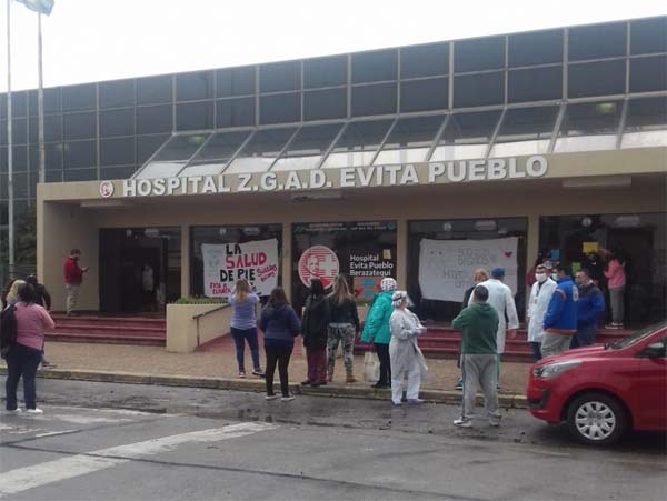 Profesionales y personal en general del hospital «Evita Pueblo» de Berazategui, protestaron hoy contra los sueldos bajos y los atrasos en los cobros, como parte del reclamo que el sector de la Salud viene haciendo en casi todo el Conurbano.