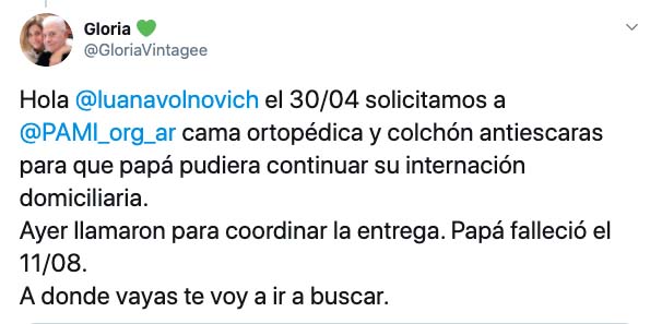 Mediante la red social, la usuaria Gloria (@GloriaVintagee) fue divulgando «los reclamos necesarios al PAMI para que su padre reciba la atención médica correspondiente en tiempos de pandemia».