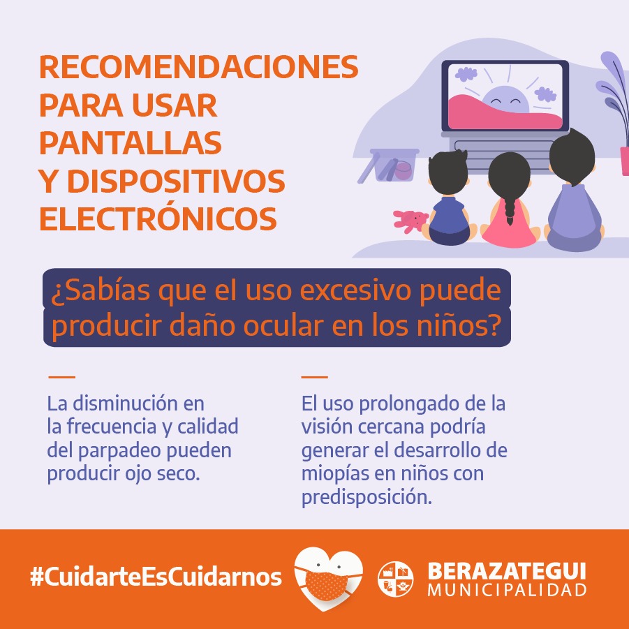 La Secretaría de Salud Pública e Higiene de la Municipalidad de Berazategui comunica una serie de recomendaciones que brinda la Sociedad Argentina de Oftalmología Infantil (SAOI), con el fin de regular el consumo de pantallas y dispositivos electrónicos en niños, ya que su uso excesivo puede provocar daños oculares.