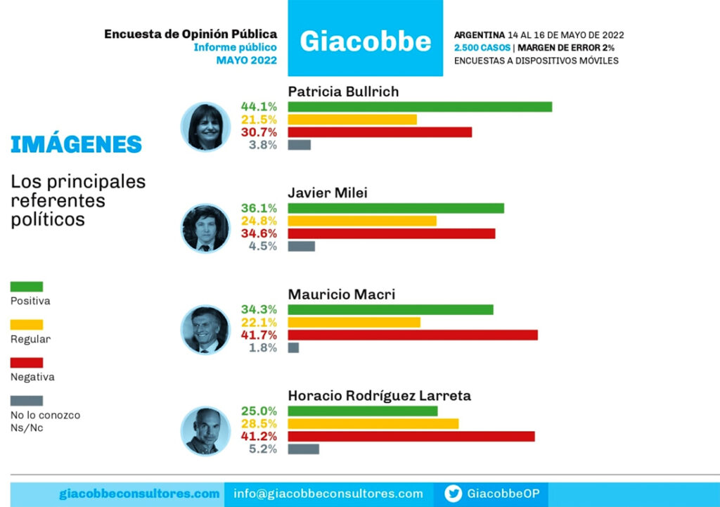 Ante esto, la consultora Giacobbe realizó una encuesta que alimentó la feroz interna para definir qué candidato será el indicado para representar a la coalición opositora y obtuvo resultados favorables para la ex ministra de Seguridad bajo la gestión del ex presidente Mauricio Macri.