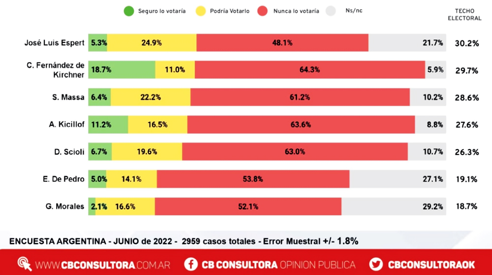 En el último sondeo de CB Consultora, ante la pregunta a los participantes sobre si votarían a los candidatos presentados, el 18,7% aseguró que sí la votaría, pero una gran porción representada en el 64,3% aseguró que no lo haría.