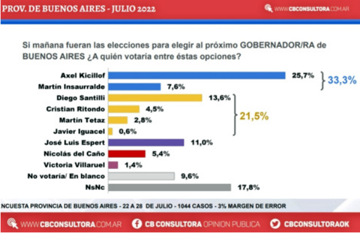 Nuevamente, la empresa CB Consultora Opinión Pública realizó una nueva encuesta en la provincia de Buenos Aires, que arrojó como resultado que Axel Kicillof y Diego Santilli serían los candidatos a gobernador bonaerense más votados en unas hipotéticas elecciones PASO.
