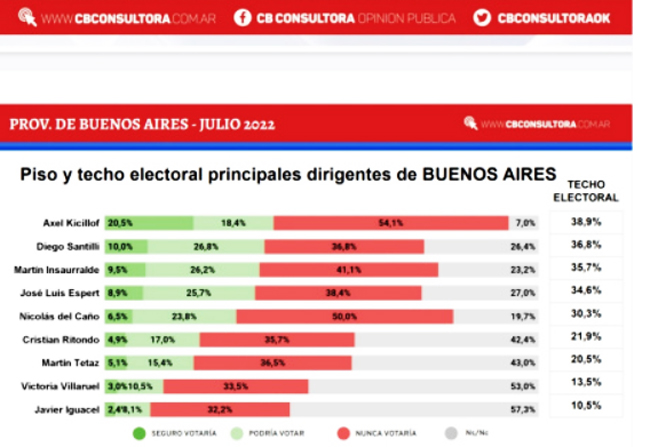 Respecto al techo electoral de los hipotéticos candidatos de cara al 2023, Kicillof y Santilli también obtuvieron los mejores resultados. El 20,5% manifestó que «seguro» votaría al candidato del Frente de Todos y el 18,4% señaló que «podría votarlo», lo que da un techo electoral del 38,9%.