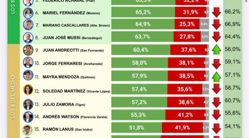 En el top de intendentes con mejor imagen también se encuentran Leonardo Nardini de Malvinas Argentinas, en el segundo lugar con (42,9%); y Fernando Gray de Esteban Echeverría con (38,7%) en el tercer lugar.