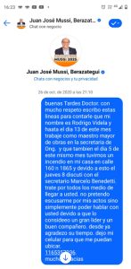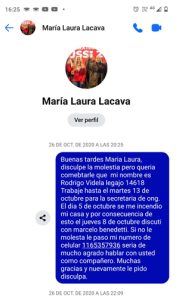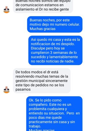 «Aún así, reclamé ayuda tanto al intendente Mussi como a la secretaria de Desarrollo Social María Laura Lacava, pero nadie hizo nada por mi familia. Benedetti decía que no contaba con elementos para ayudarnos, cuando yo mismo levantaba con gente de la secretaría, viviendas en los barrios, y a mi ni siquiera me brindaron chapas para hacer un techo… Lacava nunca me contestó y sobre Mussi, me respondió su ‘equipo de comunicaciones’ que me cortó el reclamo diciendo que ‘esos pedidos no se lo pasan al intendente por el aislamiento por el COVID’, como si un mensaje fuera contagioso» puntualizó Rodrigo Videla, quien aseveró que «Trabajé contratado de manera que no fui indemnizado, no tuve ayuda de nadie, quedé en la calle en todos los aspectos…» graficó.