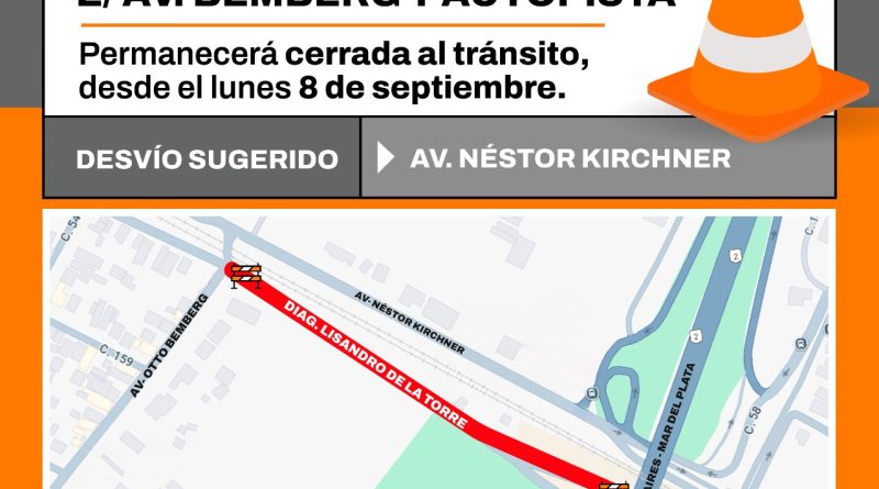 La Municipalidad de Berazategui informó que, por obras de repavimentación, desde este lunes 8 de septiembre, se mantiene cerrada al tránsito la Diagonal Lisandro de la Torre entre la Av. Bemberg y la Autopista Bs. As. – La Plata.